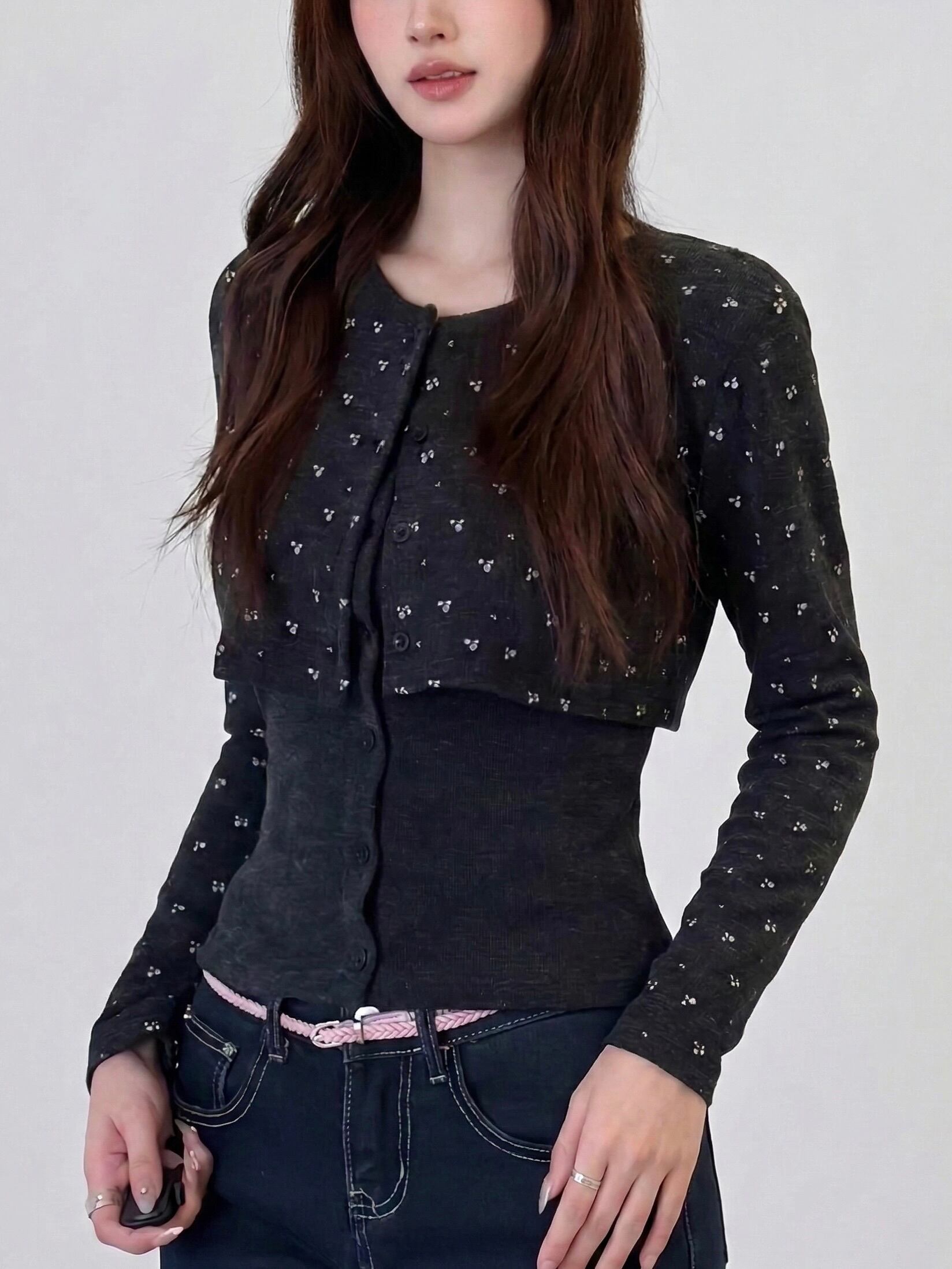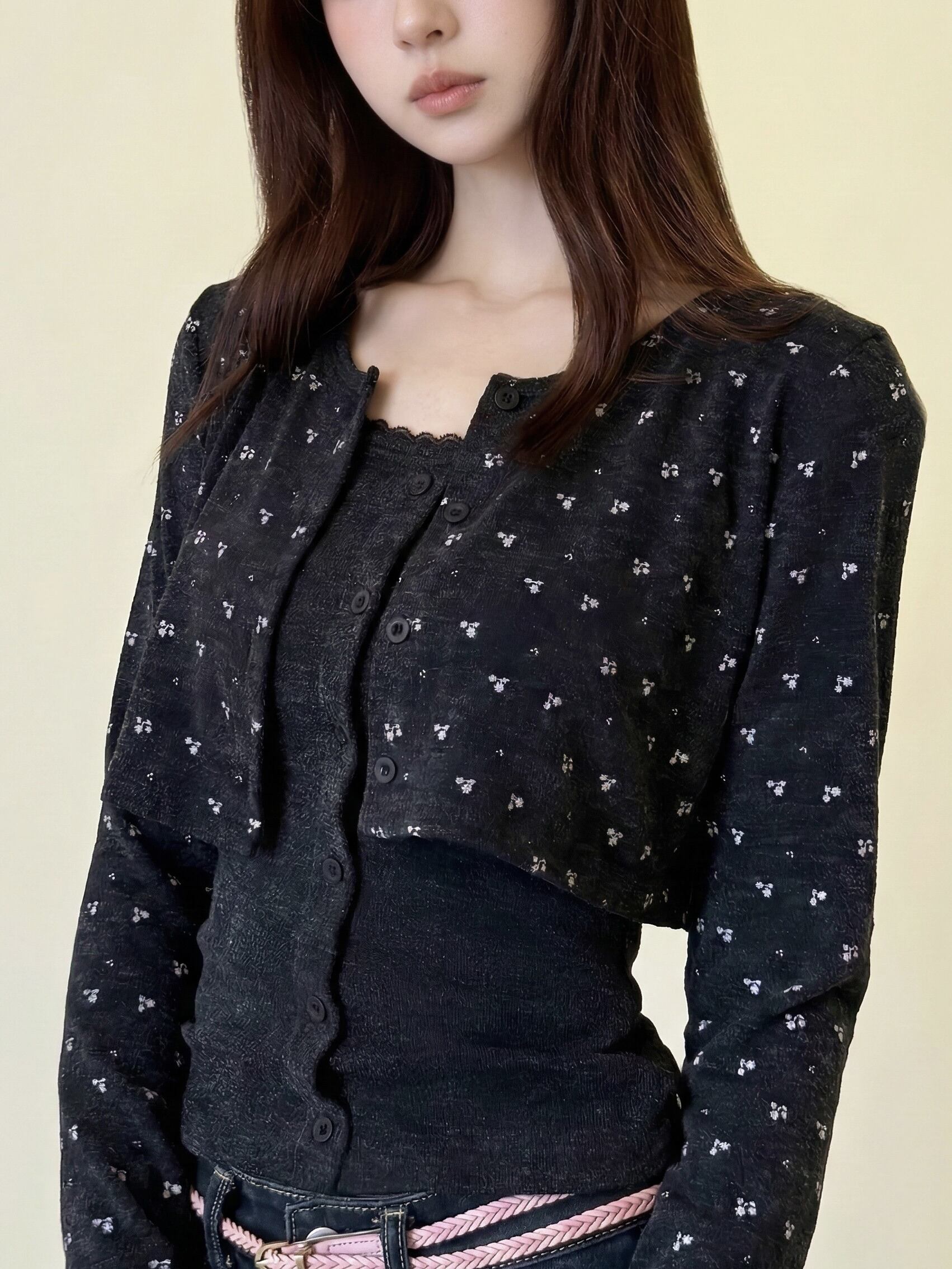 柔らかな素材感のインナーに、ショート丈カーディガンを重ねたセットアイテム。