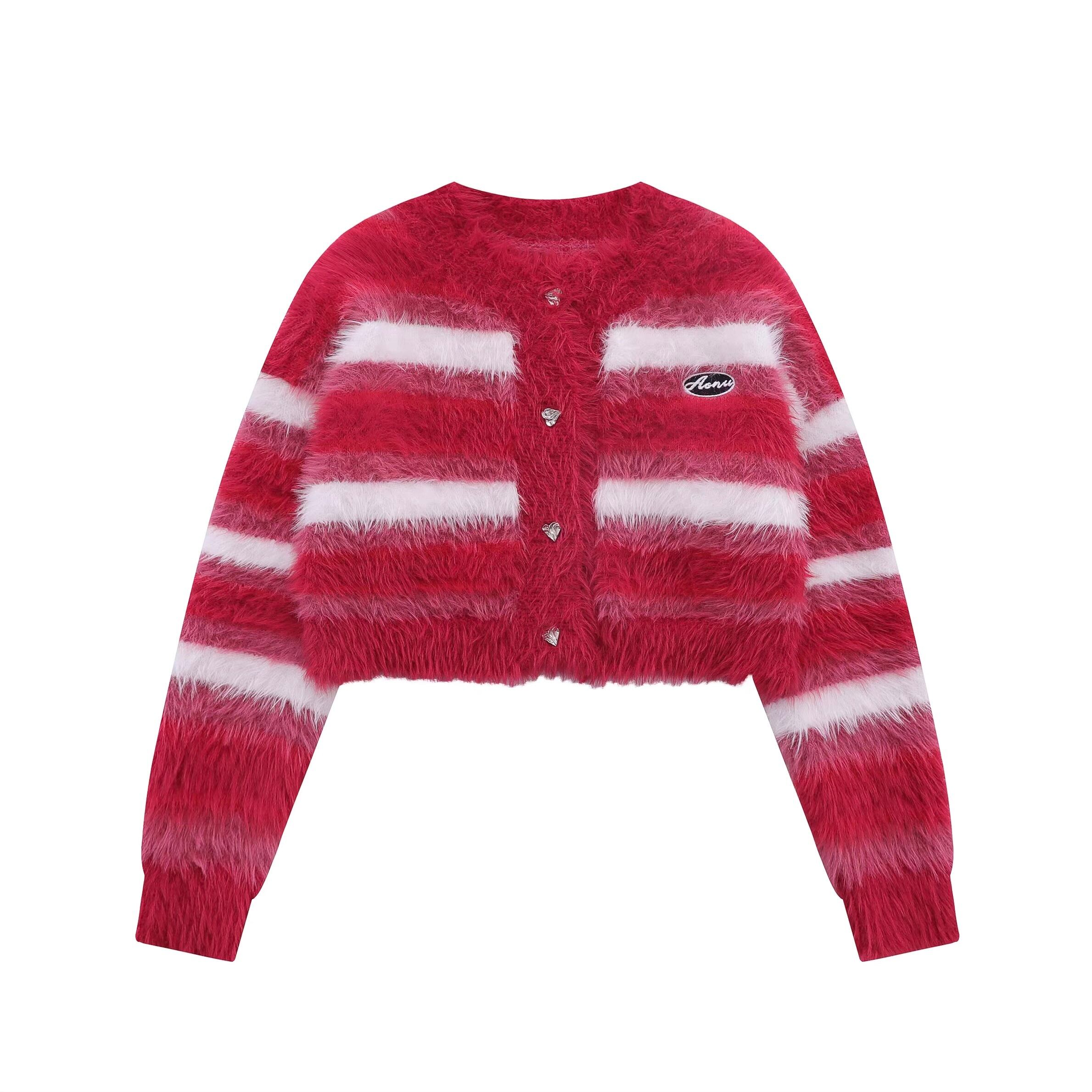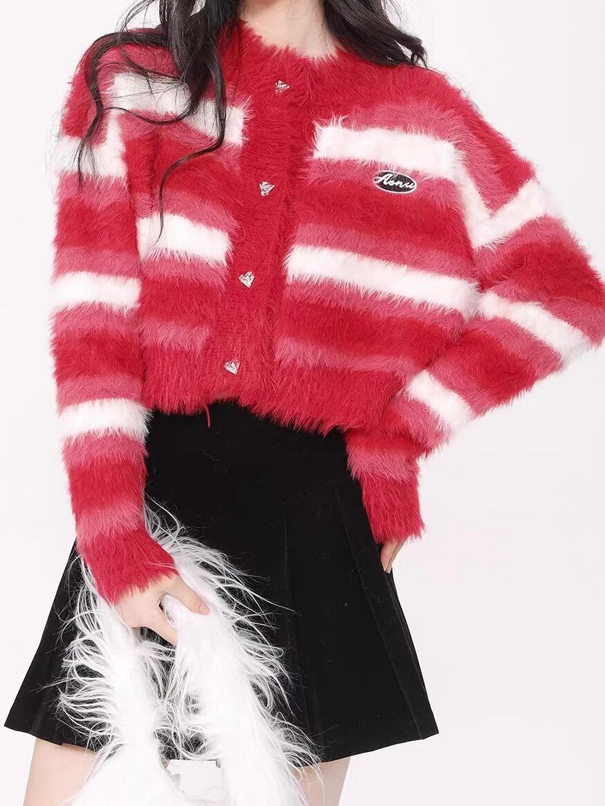 思わず触れたくなるような、毛足の長いふわふわのシャギー素材を使用したカーディガン。鮮やかなピンクのグラデーションボーダーが、暗くなりがちな秋冬のコーディネートを華やかに彩ります。