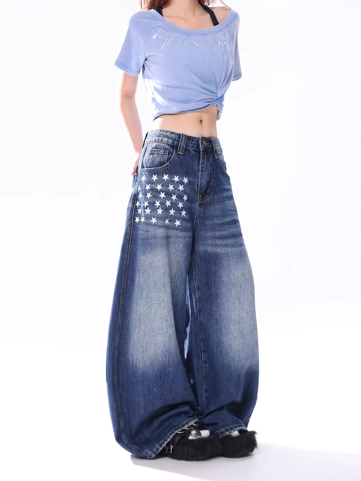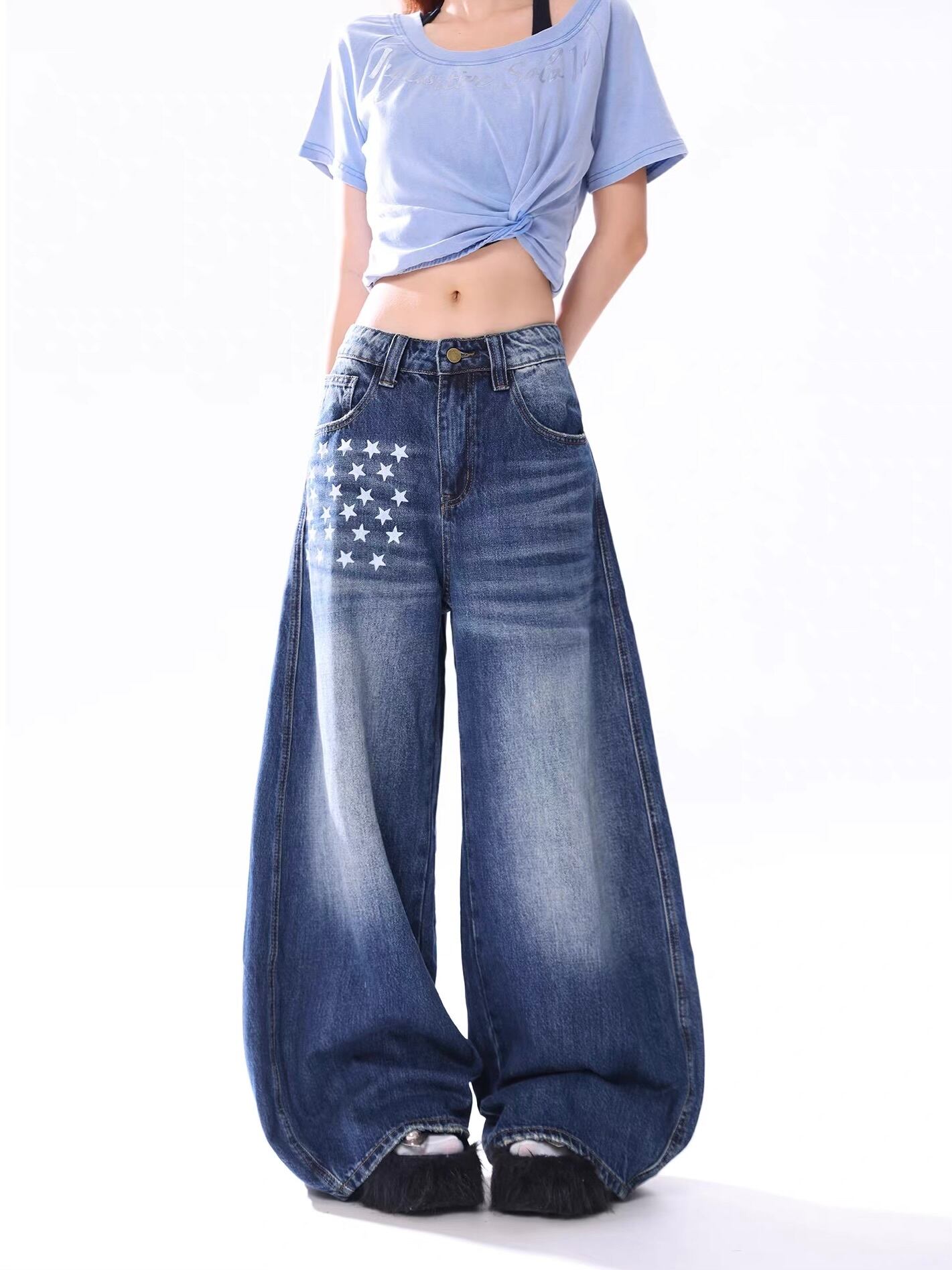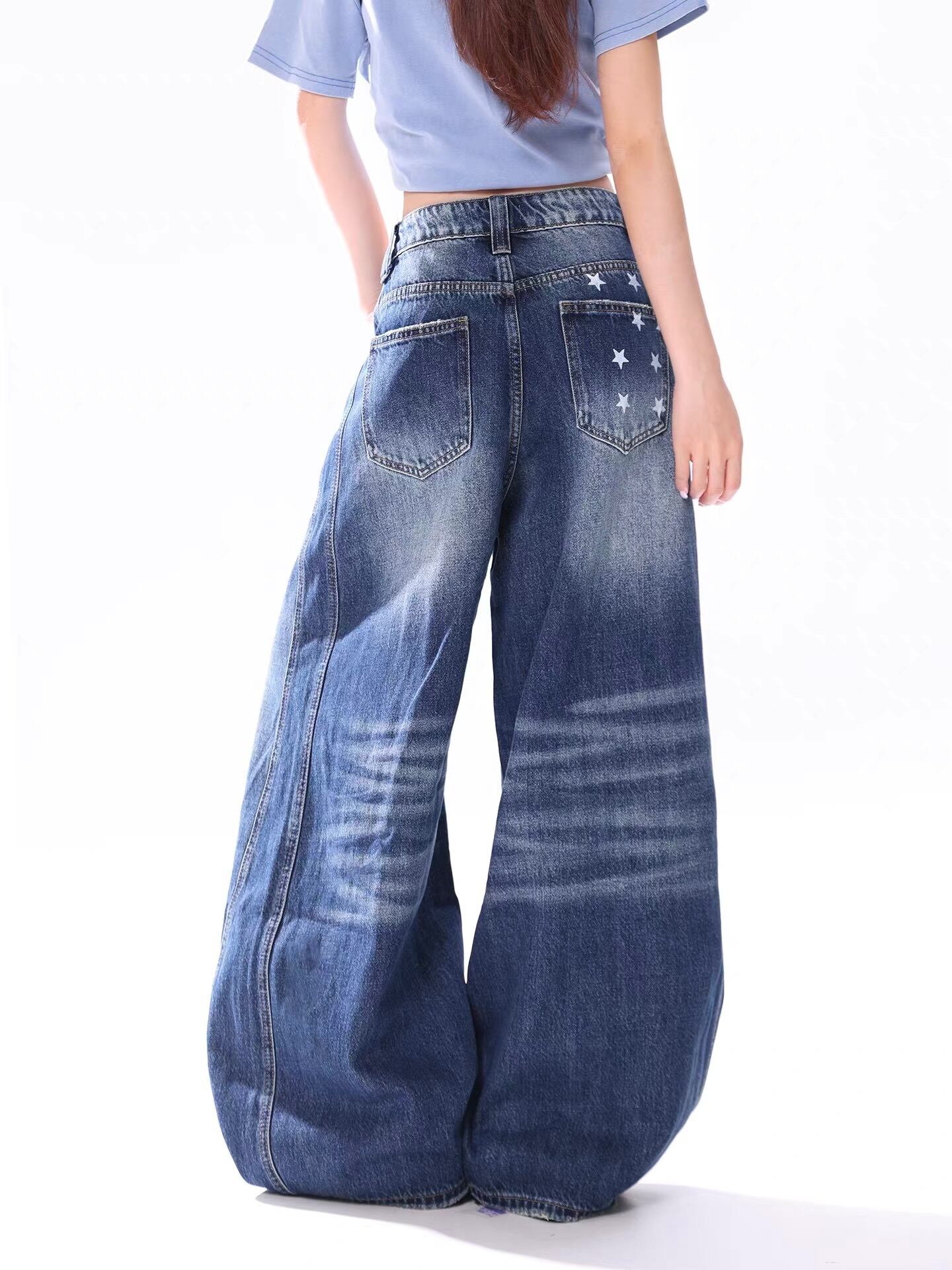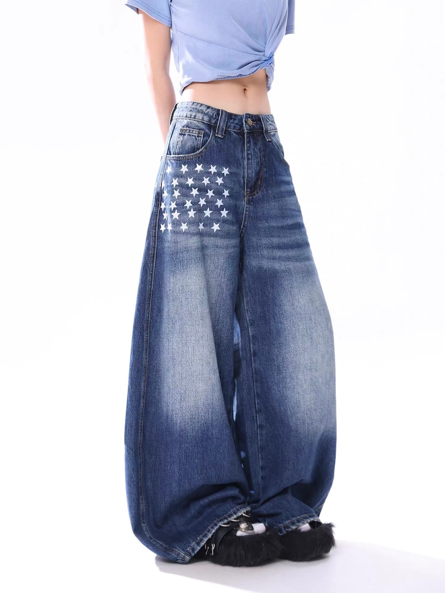 ■圧倒的な存在感!極太ワイドシルエット 足元にかけて大胆に広がるボリューム満点のバギーシルエットが特徴の一本。履くだけで今どきなルーズ感を演出でき、ストリートスタイルや韓国ファッションの主役になるアイテムです。 ■こだわりのデザインポイント ・アイコニックな星柄:フロントの右腿部分とバックポケットに配置された星柄プリントが、ヴィンテージライクなデニムにキャッチーなアクセントを添えます。 ・絶妙なウォッシュ加工:程よく着古したような色落ち感が、立体感のあるクールな表情を作り出しています。 ・体型カバーも抜群:脚のラインを拾わない極太シルエットなので、スタイルを気にせずリラックスして着用いただけます。 ■着こなしのポイント ボトムスにボリュームがあるため、トップスはショート丈のTシャツやタイトなキャミソールを合わせるのがおすすめ。メリハリのあるトレンドの「Aラインシルエット」が簡単に完成します。厚底のスニーカーやブーツとも相性抜群です。 size:S パンツ丈103cm ウエスト70cm ヒップ107cm size:M パンツ丈104cm ウエスト74cm ヒップ111cm size:L パンツ丈105cm ウエスト78cm ヒップ115cm size:XL パンツ丈106cm ウエスト82cm ヒップ119cm ◾︎ 配送期間 約10〜21営業日 ◾︎ LINEお友達追加で¥500 OFFクーポンプレゼント https://lin.ee/50nwlnR ◾︎ 必ず下記ページの「ご利用ガイド」をお読みの上 ご購入をお願いいたします。 https://kyun.official.ec/about