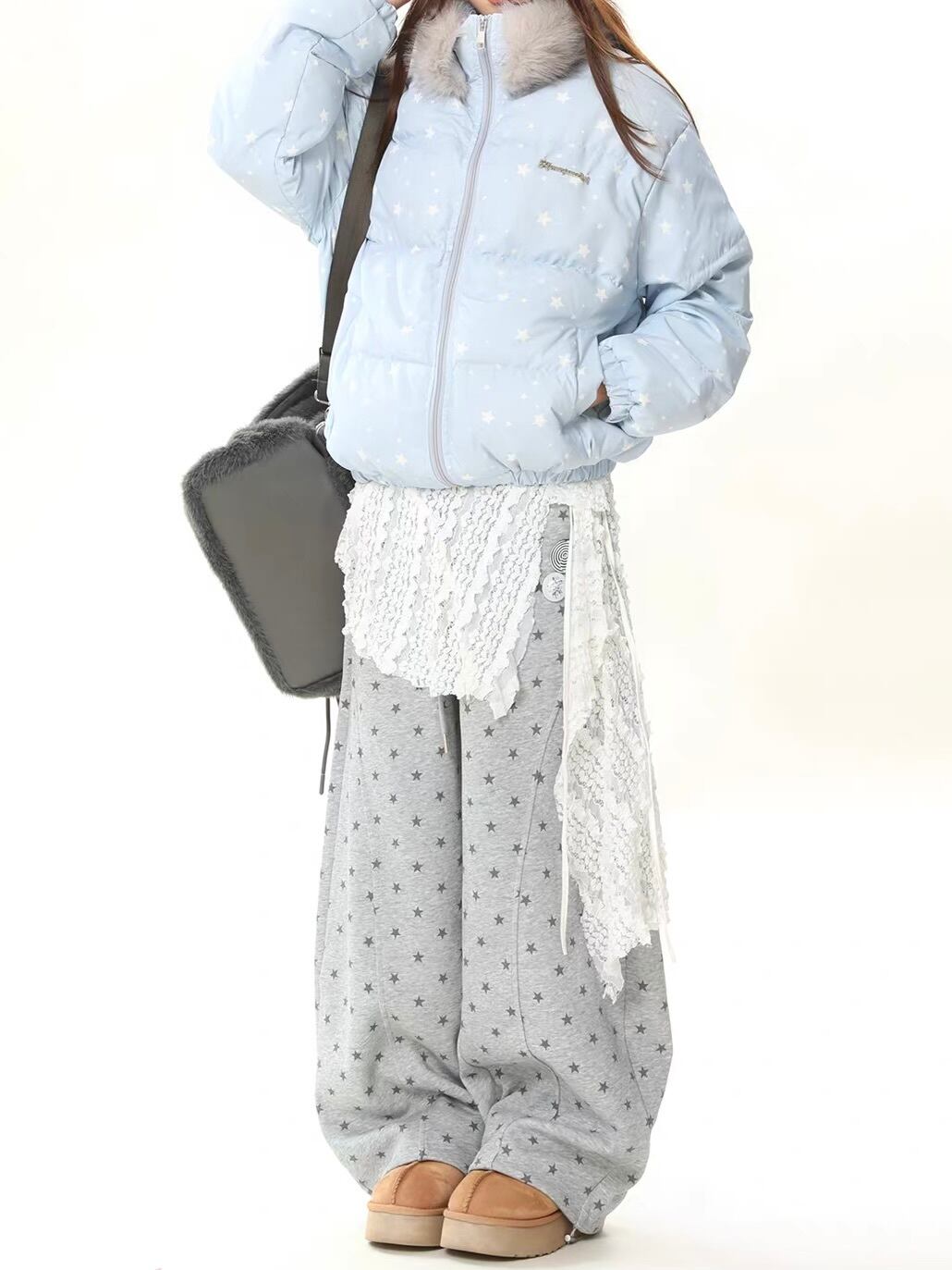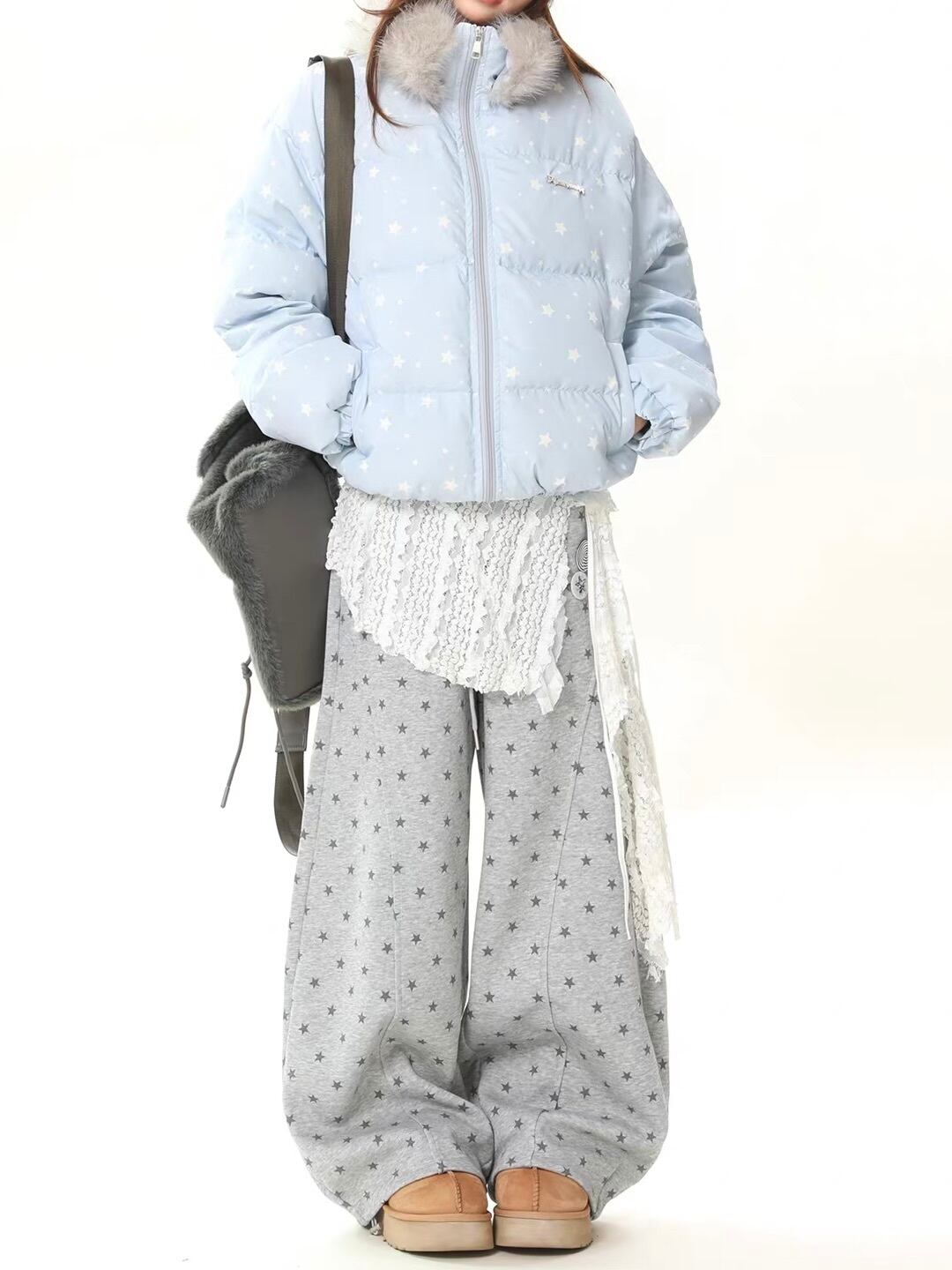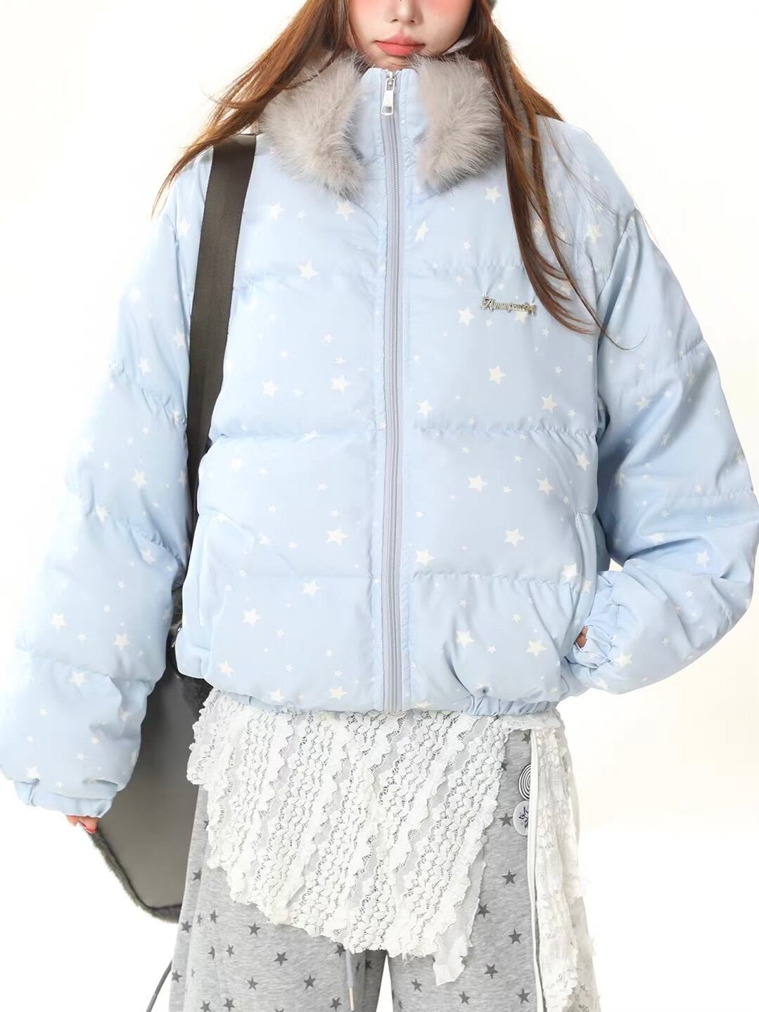 冬の空を纏うような、遊び心あふれるデザイン。 淡いパウダーブルーにホワイトの星柄を散りばめた、キャッチーなアウター。 首元にはふわふわのファーをあしらい、顔周りを華やかに、そして暖かく包み込みます。 ■POINT フェミニンな星柄デザイン 全面にあしらわれたスタープリントが、重たくなりがちな冬のコーディネートを軽やかに彩ります。派手すぎない配色で、大人のガーリースタイルにもマッチ。 size:S 着丈61cm バスト118cm 袖丈58cm size:M 着丈63cm バスト122cm 袖丈59cm size:L 着丈65cm バスト126cm 袖丈60cm ◾︎ 配送期間 約10〜21営業日 ◾︎ LINEお友達追加で¥500 OFFクーポンプレゼント https://lin.ee/50nwlnR ◾︎ 必ず下記ページの「ご利用ガイド」をお読みの上 ご購入をお願いいたします。 https://kyun.official.ec/about